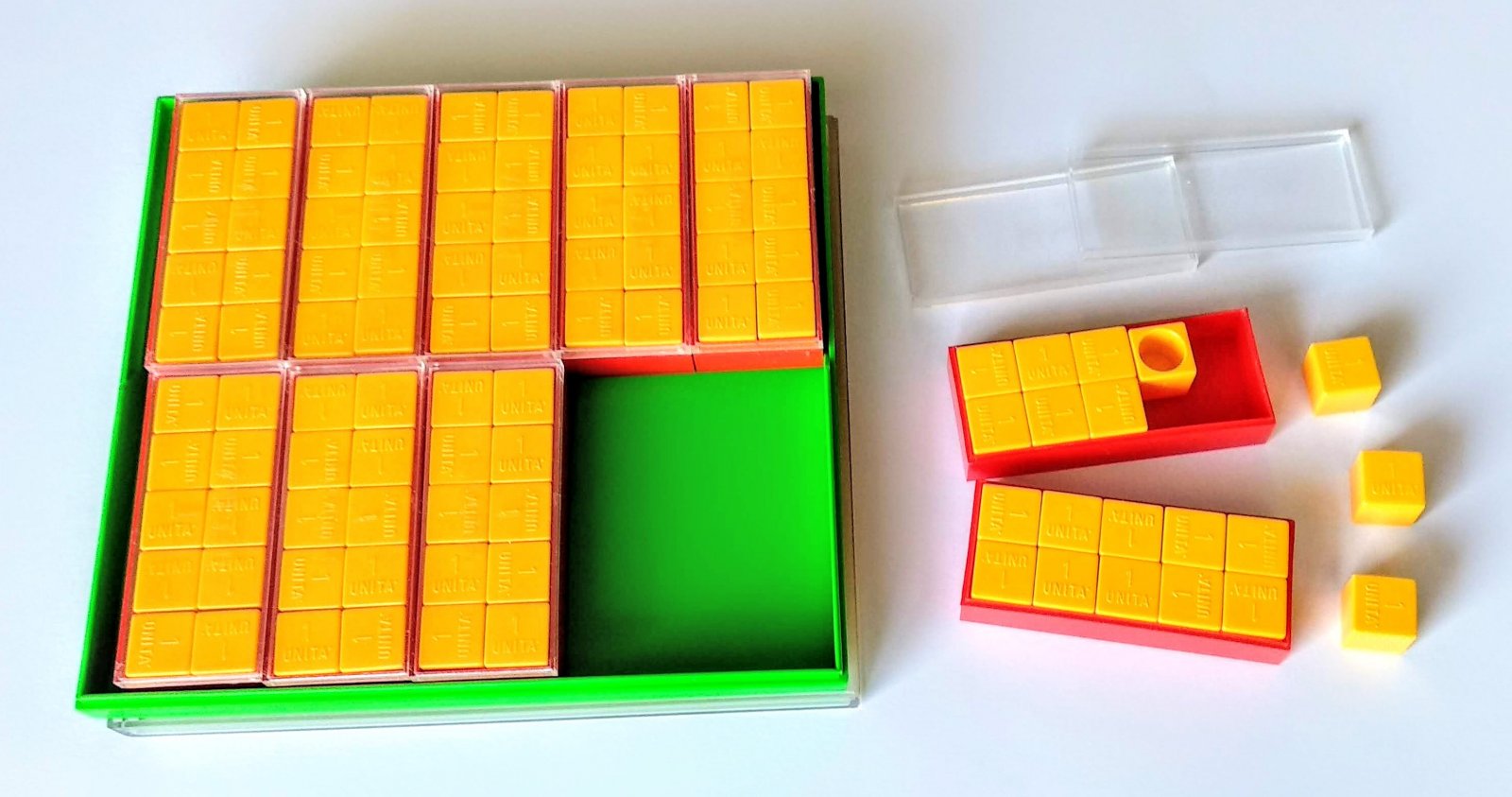 Possiamo vedere e toccare con mano il centinaio, con le sue dieci decine e le cento unità, che costituiscono un modello del nostro sistema di numerazione.Tutti i concetti fondamentali previsti nei programmi di tutta la scuola primaria vengono acquisiti piacevolmente, e %u201Dscoperti%u201D dai bambini attraverso esperienze e giochi effettuati in classe con il materiale strutturato.