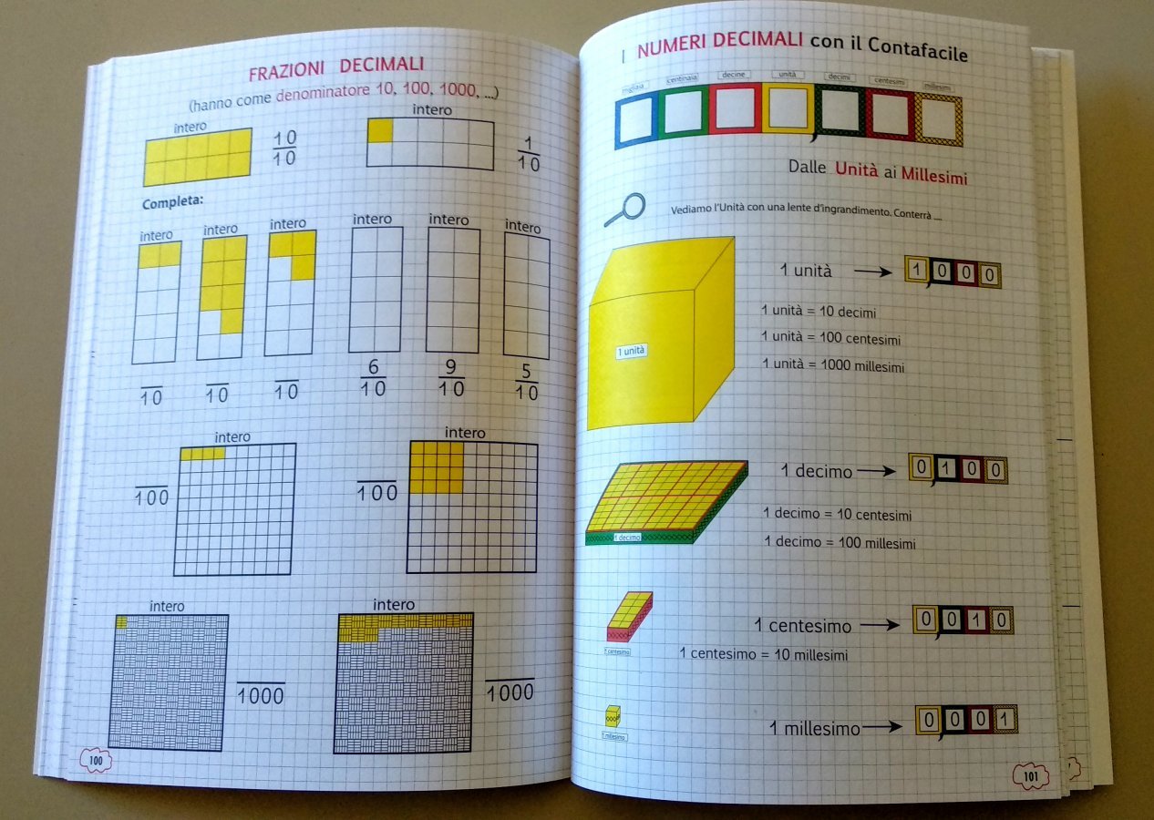 Il Contafacile permette di concretizzare le Migliaia, le Frazioni, i Decimali e di "vivere" direttamente tutte le esperienze matematiche; così grazie ai fantastici cubetti, "Multipli e Divisori, Percentuali, Prove e Proprietà" non sono più parole oscure, le "Equivalenze" non ci annoiano e le "Aree o i Volumi" non mettono più paura!