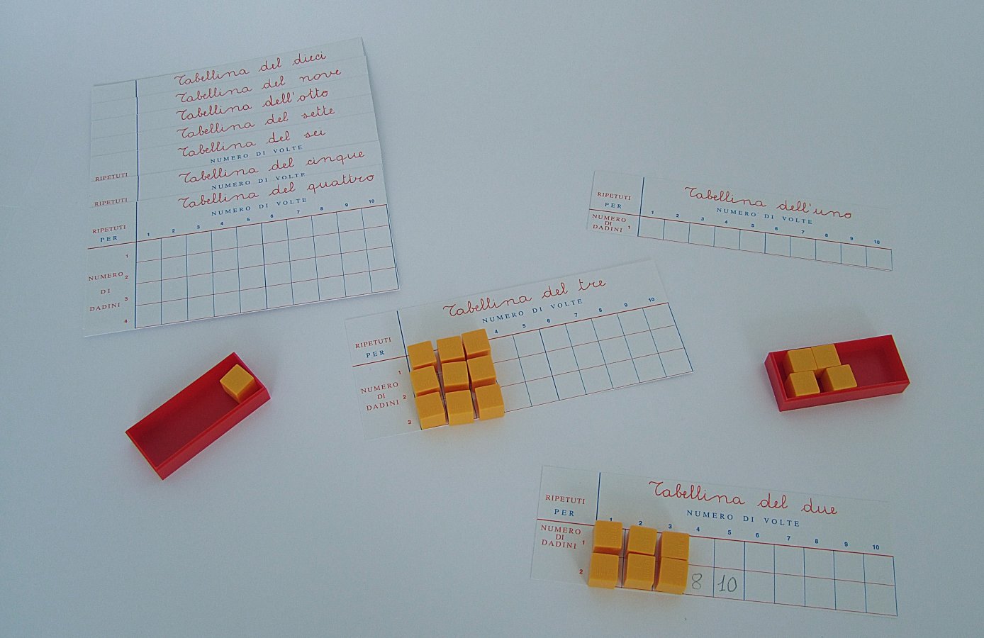 La Tabellina Simpatica è formata da dieci Cartoncini, ognuno dei quali con l’uso dei cubetti o altro materiale consente di "costruire" le singole Tabelline, dalla tabellina dell’uno alla tabellina del 10.